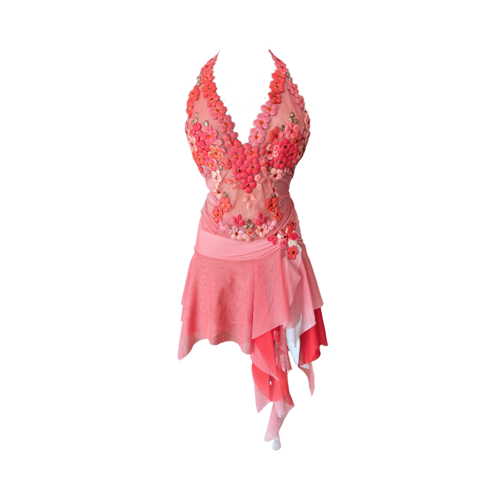 Detailed with orange gemstones and subtle bronze leaves. With the prettiest flowy asymmetrical skirt!